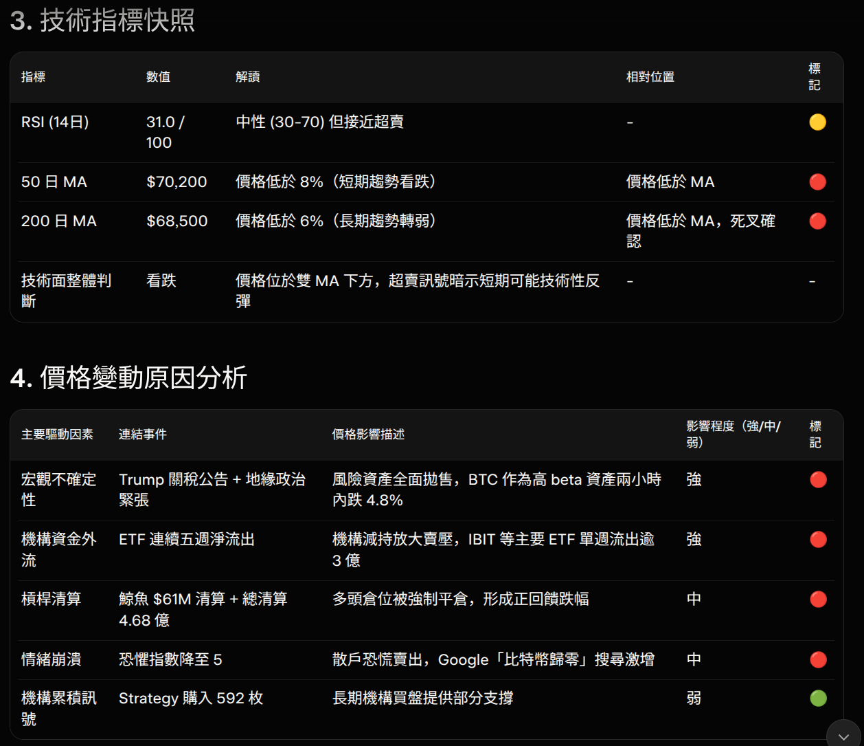 | 200 日 MA | $XX,XXX | 價格高於/低於 X%(長期趨勢) | 🟢/🔴 |