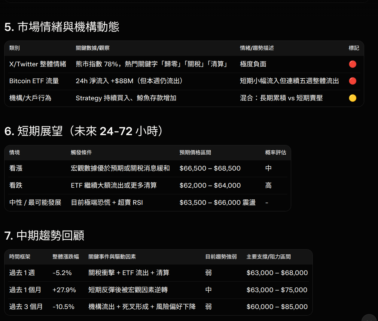 報告內容包含最新價格、技術指標、24 小時重要新聞、ETF 流量、市場情緒,以及中期趨勢分析。所有輸出都使用固定格式、表格和 emoji 標記,讓內容容易閱讀。