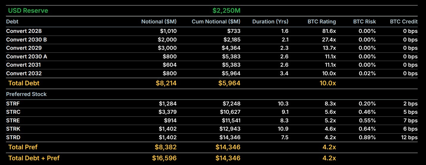 債務結構風險: 超過 165 億 的總負債(債務+優先股)在牛市是助燃劑,但在波動劇烈的環境下,這 28% 的槓桿極易反噬,從 2028 年開始,如果股價不能高於下表中的 Ref Price 的話,開始有大額的還款壓力存在,尤其是 2029 年底到期的 30 億美金債務,將要成零成本的債務,轉換成 10%+ 以上的債務,在熊市時,更進一步的打擊股價。