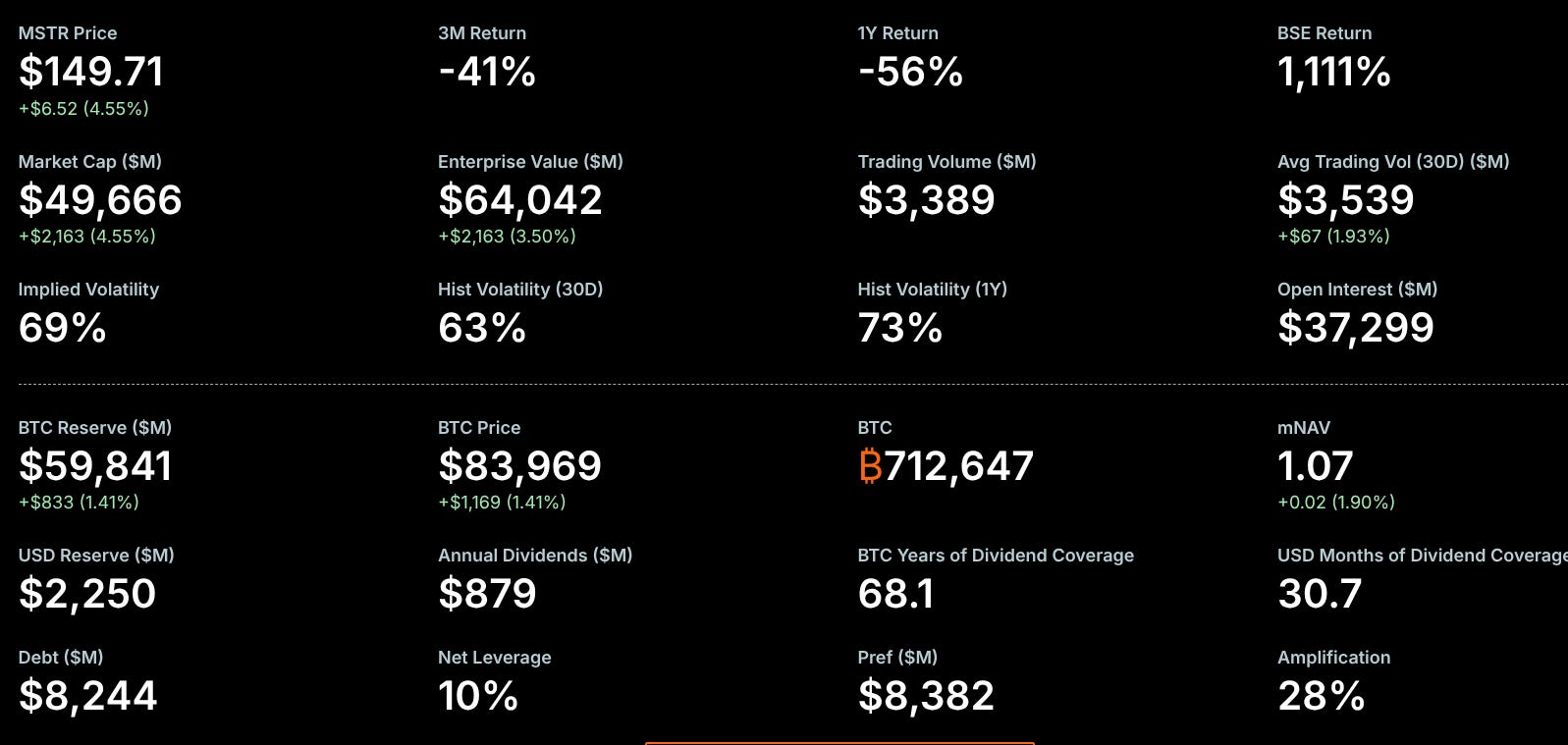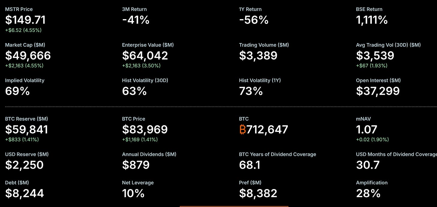 因為債務與優先股的存在,MSTR 為投資人提供了一個約 28% 的內建槓桿。也就是說,當比特幣上漲時,MSTR 的股價漲幅理論上會放大。